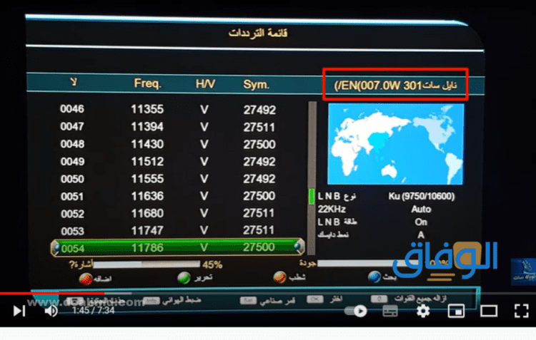- القيام باختيار القمر الصناعي النايل سات.
