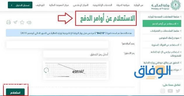 استعلام عن امر دفع أحد الخدمات التي تقدمها وزارة المالية في المملكة العربية السعودية، وهي خدمة تتم بطريقة إلكترونية عن طريق الرابط الذي خصصته الوزارة للاستعلام، يتمكن الأفراد من تقديم الاستعلام عن طريق رقم الهوية 1444، يقوم الموقع بتوفير عدد آخر من الخدمات الإلكترونية الهامة؛ والتي سوف نتعرف عليها في السطور القادمة عبر موقع الوفاق- wiifaq.com.