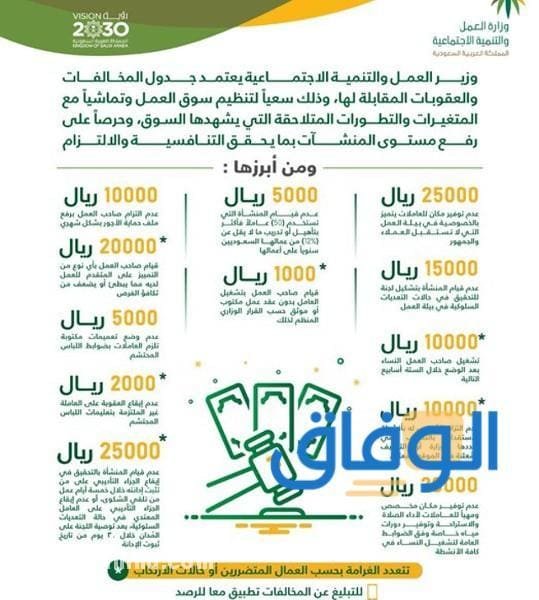 أعلن مكتب العمل في المملكة العربية السعودية أن هناك غرامة مالية ثابتة قام مكتب العمل يفرضها وتبلغ 5000 ريال سعودي في حال ارتكاب ما يلي: