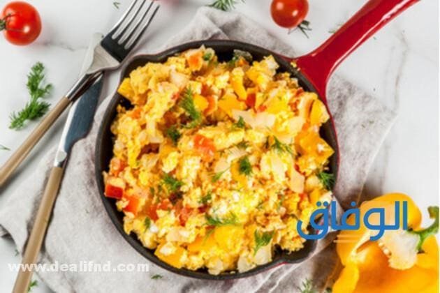 - ثم نرفع المقلاة من على النار وبهذا يكون البيض بالفلفل الملون جاهز للتقديم كوجبة خفيفة على العشاء أو على الفطور.