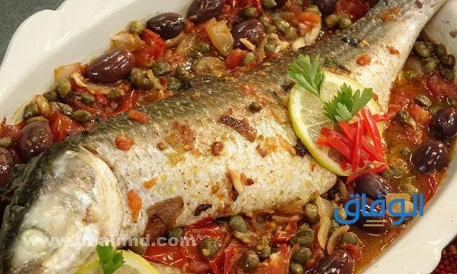 • نأخذ صينية مدهونة بالزيت ونضع عليها السمك والبطاطس وورق الغار ونزين الوجه بالزيتون الأسود.