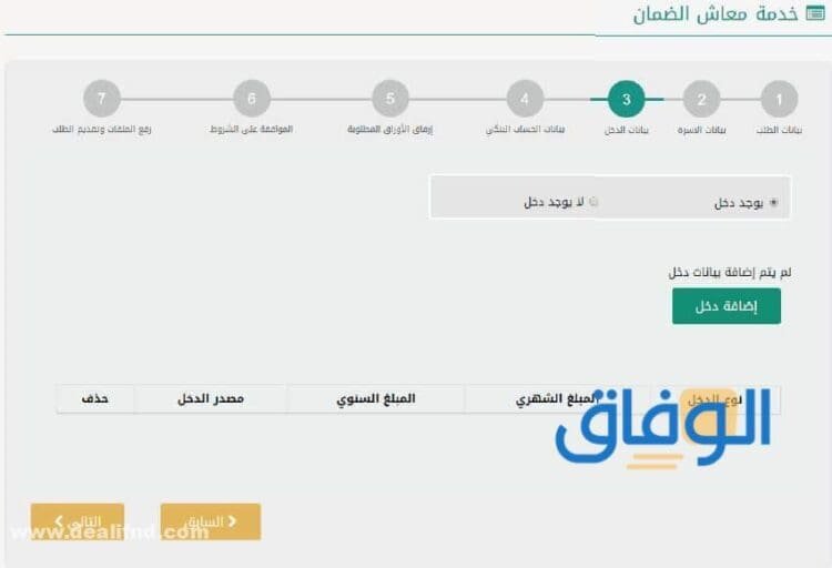 - يجب كتابة كل البيانات المتعلقة بالدخل الشهري وكل أفراد أسرته وبعد كتابة الدخل المكتسب سوف يتم اعتماد نصف الراتب أو الدخل الشهري 50%، ويتم تسجيلة في الملف الشخصي ويجب على المتقدم بكتابة كل أنواع الدخل التي يحصل عليها المستفيد الرئيسي والذين يتابعونه.