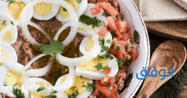 - يتم تزين الطبق ببعض شرائح البيض المسلوق والبصل والطماطم المفرومة وزيت الزيتون.