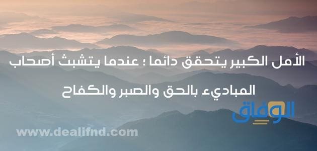 - الأمل الكبير يتحقق دائما ؛ عندما يتشبث أصحاب المباديء بالحق والصبر والكفاح ( محمد غزالي ) .