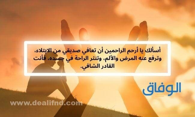 - أسألك يا أرحم الراحمين أن تعافي صديقي من الابتلاء، وترفع عنه المرض والألم، وتنثر الراحة في جسده، فأنت القادر الشافي.