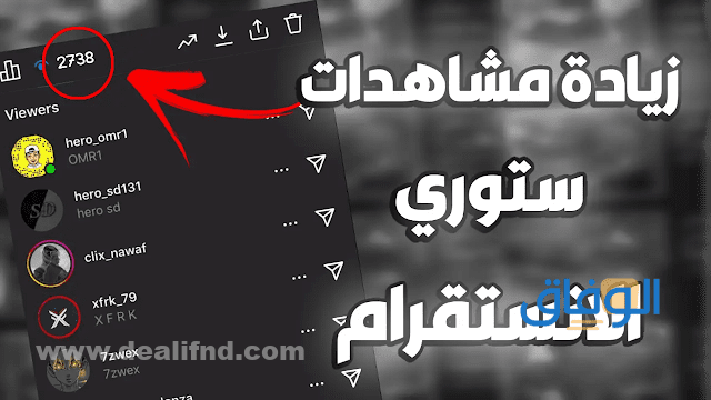 - يستخدم موقع الويب هذا طريقة غير مباشرة لزيادة نسبة مشاهدة قصصك على Instagram. من خلال زيادة عدد المتابعين على حسابك ومن ثم ستزداد نسبة مشاهدة قصصك تلقائيًا، الدخول من الموقع من هذا الرابط.