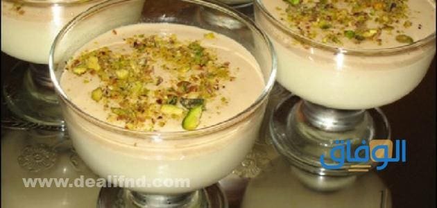 - بعد ذلك يتم صب الخليط في كاسات التقديم ويمكن القيام بوضع قاعدة من البسكويت قبل صب الخليط وفقا للرغبة.