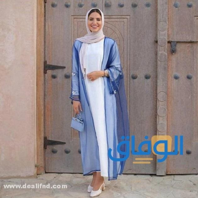 تُجسد تلك العباءة المعنى الأصلي للرقة والأناقة في الوقت ذاته.. فتعتمد على الجزء الداخلي منها الذي يظهر باللون الأبيض، بينما يظهر الكاردي الخاص بها باللون الأزرق الفاتح الشفاف.. ومن هنا نشير إلى أنها تشتمل على بعض النقوشات والأزهار ذات اللون الأبيض، وارتداء الحجاب بتلك الألوان أو باللون البيج الفاتح سيكون الخيار الأمثل لإبراز جمال تصميم تلك العباءة.