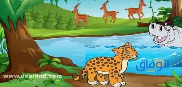 - فبحث فرس النهر هنا وهناك فلم يجد ثم اقترح على النمر أن يمكث على ظهره ويعبر به إلى هناك.