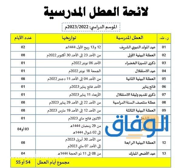 يوفر موقع الوفاق- wiifaq.com جميع تفاصيل لائحة العطل المدرسية 2023 داخل دولة المغرب، وذلك لجميع المراحل الدراسية الابتدائية والإعدادية والثانوية وفقًا لما حددته وزارة التربية الوطنية والتعليم الأولي والرياضة التابعة للحكومة المغربية.