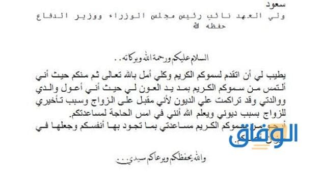 لا يوجد مواطن على أرض السعودية لا يعرف مدى جهودكم في تطوير الوطن وبناء شباب المستقبل.. فأنتم دائمًا تقدمون المساعدة لكل محتاج.. وذلك جعلني اطلب منكم مساعدة مالية نظرًا لتعرضي لأزمة مالية والسبب يرجع وراء……..