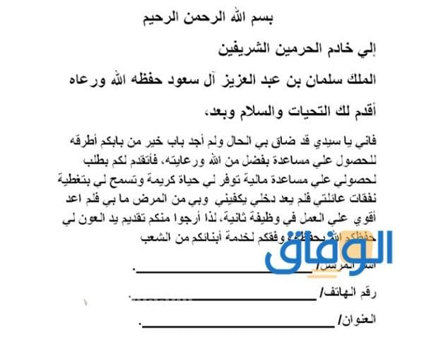 معروض طلب مساعدة مالية من الديوان الملكي يتم الاستعانة به من أجل طلب يد العون من مؤسسة سلمان آل سعود لغرض العلاج، أو لتغطية نفقات الأسرة أو تكاليف الدراسة، وإليكم مزيد من التفاصيل عبر (موقع الوفاق – wiifaq.com).