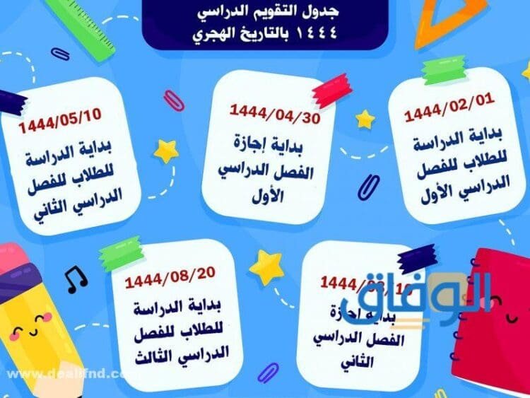 - يبدأ الفصل الدراسي الثالث يوم الأحد الموافق 20 من شعبان 1444 الموافق 12 من مارس 2023.
