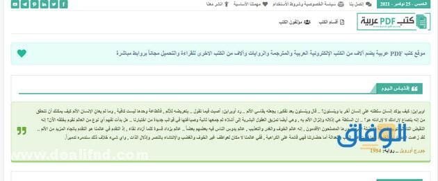 كما يعتبر من ضمن أفضل موقع لتحميل الكتب بصيغة pdf حيث انه المنصات التي تحتوي على الكثير من الكتب والمؤلفات العربية والعالمية ويتم فيها نشر المحتوى بكل انواعه وكذلك نشر الكتب المترجمة عبر هذه المنصة سوف تتمكن من الوصول إلى أي كتاب او مؤلف ترغب به سواء الإسلامية او التاريخية او أي نوع من أنواع الكتب.