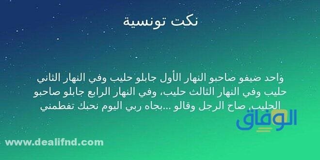 تعد اللهجة التونسية واحدة من أجمل اللهجات العربية؛ كما أنها تمتاز بطريقتها المحددة في النطق، والتي تجعلها مختلفة عن غيرها من طرق النطق لعدد من الدول في الوطن العربي، و النكات التونسية واحدة من أكثر النكت جمالاً وقدرة على رسم الضحكة على وجوه الناس، وهناك عدد من النكت الجميلة والتي تحكي موقفاً بطريقة رائعة ومسلية، ومنها: