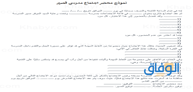 في تمام الثامنة والنصف من صباح اليوم…….. الذي يوافق تاريخ…. /….. /……. م لقد تم عقد اجتماع لأعضاء هيئة التدريس وكان عنوانه……… وتم في القاعة الخاصة بمدرسة………. وكان ذلك تحت إشراف السيد رئيس المدرسة……………….. ولقد حضر الاجتماع كلًا من :