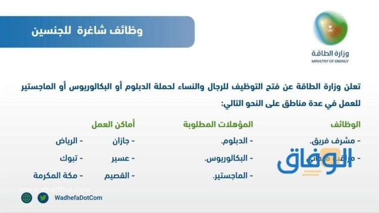 قامت وزارة الطاقة داخل المملكة العربية السعودية بالإعلان عن توفر العديد من الوظائف التي تناسب مختلف المؤهلات الدراسية بداية من البكالوريوس وحتى الدبلوم، وأهم هذه الوظائف هي التالي: